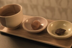 黒糖か梅干しと一緒に国産茶をお楽しみください。